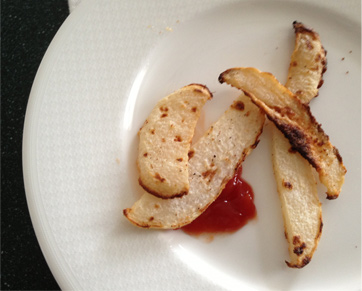 Following my usual protocol, I read up on what kinds of things people make with the vegetable on the chopping block and saw most suggesting a salad or slaw. I figured I could handle that. After washing off my softball, I peeled it and began cutting it into manageable sized chunks. My first attempt was a Green Apple Pineapple Jicama Salad with my inspiration being a Waldorf Salad. Strike one. Okay, so no salad and moving onto slaw. I shredded almost another half of the jicama and tried to toss together a Pineapple Jicama Slaw with some lime juice and honey, etc. I still liked the idea of pineapple but this too was an utter failure. Strike two. With very little of the veggie left, I decided that I couldn’t figure out how to make it tasty raw and looked up cooking it. Not too many things out there so I tried doing fries. I scraped together the final pieces thick enough for standing a chance in the oven and hoped for the best. Strike three. Not even ketchup made them taste better to me. Is that even possible? I love ketchup! I ran out of jicama at that point and decided that after three strikes, I was outta there. No more.