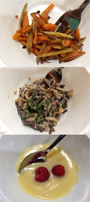 The second included kale! In the Gluten Free Linguine with Sesame Sauce and Greens, the greens were kale! That makes me smile. And the black and white mix of noodles she chose was eye-catching, although admittedly looked a bit muddled with the sesame sauce on them.